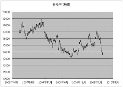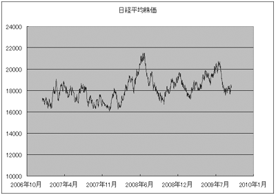 いやー伸び悩んでいますねー。2007年初頭に1万8千円を突破し、1万9千円をうかがう気配を見せるものの、その後急落して1万6千円付近まで落ち込み、その後再度1万9千円に戻すもののそこから2008年にかけて緩やかに降下。1万3千円付近でテクニカル派の崇める「逆三尊」のような形を形成して大底を打ち、2009年にかけて上下しながら1万7千円を復活。
