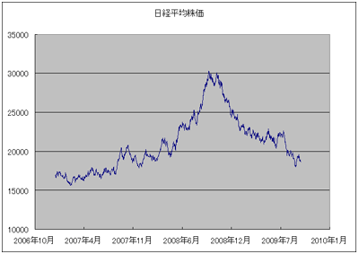おおー今度は「バブル再来」ですねー。2008年夏から秋にかけて日本経済は一気に3万円突破にまでヒートアップ。まさに2008年日本の夏は熱い!しかし、過去にバブルの痛みを経験して懲りている日本株式市場は3万円の大台突破を見て怖くなり、利益確定の売りに走る。その売りがまた売りをさそい、株価は2009年に向けて一気に2万円を割り込むまで急落!