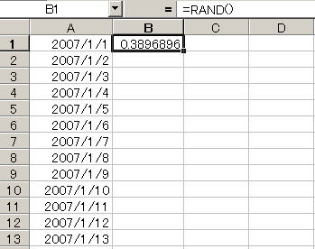 次に乱数を発生させます。excelの乱数発生器はRANDという関数なので、セルに=RAND()と書けば0から1までの間の乱数が発生されます。こんな感じです。