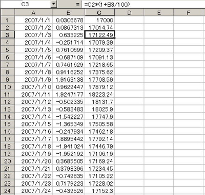 翌日の2007年1月2日は前日よりセルB2にあるパーセントだけ日経平均が上下したとします。例えばB2が+1.00であれば2007年1月2日の株価は17000*(1+1.00/100)=17170円になります。7時のニュースで「日経平均終値は昨日より170円上昇して17170円でした」と報道されるわけです。同様にB2が-1.50であれば1月2日の株価は17000*(1-1.50/100)=16745円になります。7時のニュースで「今日の日経平均は、幅広い銘柄で売りが広がり、昨日より255円安い16745円となり17000円を割り込みました」と報道されるわけです。この計算をB3,B4と繰り返しやっていきます。こんな感じです。