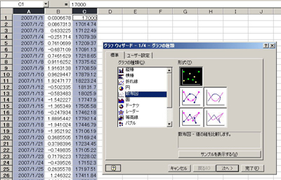 さて、後はA列とC列をグラフにプロットしてみればできあがりです。A列とC列を選択してから、散布図を選べばプロットしてくれます。