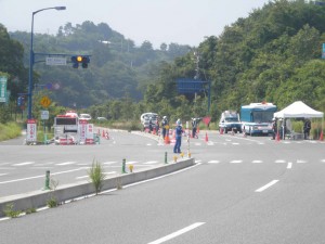 道はここで封鎖されている。ちょうど常磐道の広野インターのすぐ近く。東京電力広野火力発電所の所。このあたりで福島原発から大体20km。このあたりは年間被爆領が4000~5000マイクロシーベルトとされていて、後で訪れる浪江町や飯舘村に比べるとかなり低い。それでも警察官のマスクが緊張感を物語る。またなぜだかわからないが右翼が集まってきて街宣していた。原発の事故というのは右翼心を刺激するらしい。